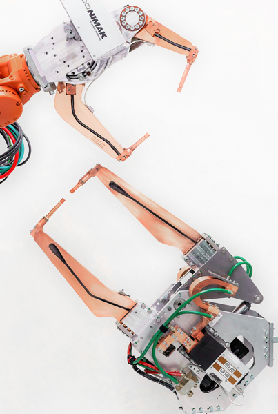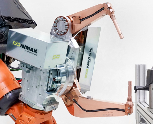 NIMAK ha scelto Galaxie® D nella taglia 135 per il suo design compatto e l’alta densità di potenza. Gli ingegneri dell’azienda hanno così potuto inserire l’intera unità di trasmissione direttamente nel punto di rotazione della pistola e fare a meno del classico corpo della pistola. Tutto questo si traduce in una riduzione fino al 50% del contorno d’interferenza della pistola sul robot.
